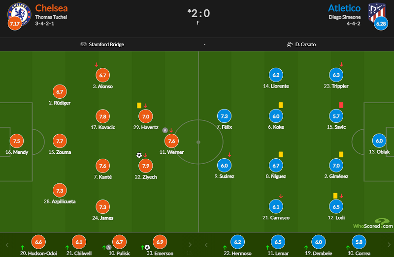 评分方面,齐耶什以7.9的评分收获全场比赛最高评分,科瓦契奇以7.8的评分紧随其后;马竞方面,费利克斯以7.3的评分收获全队最高评分。